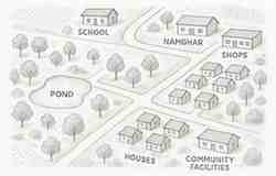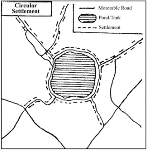 Circular Settlement: Houses are arranged in concentric circles around a central feature such as a pond or community hall.
