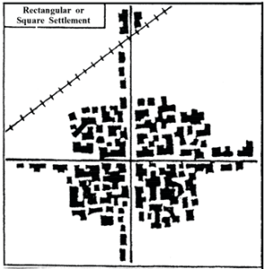 Rectangular Settlement: Houses and roads are arranged in a grid-like pattern, intersecting at right angles. This type is common in flat, fertile plains.