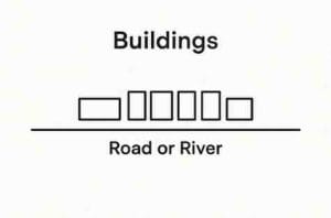 Houses are arranged in a straight line along roads, rivers, railways, or coastlines. Common in river valleys, transport routes, and foothills of mountains.